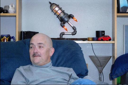 Jon with a really cool rocket lamp on the shelf behind him. |
